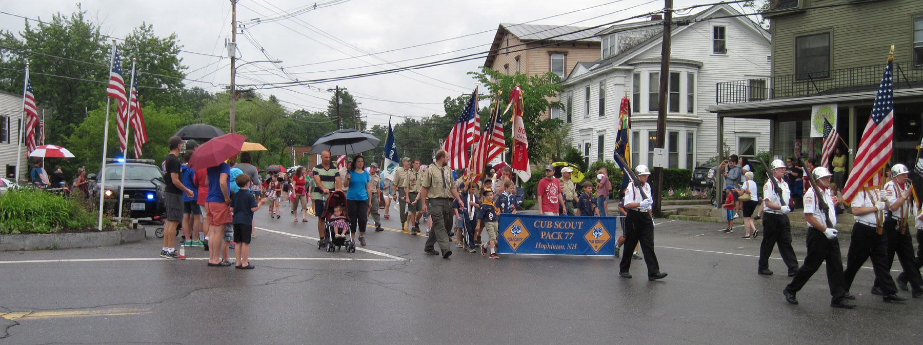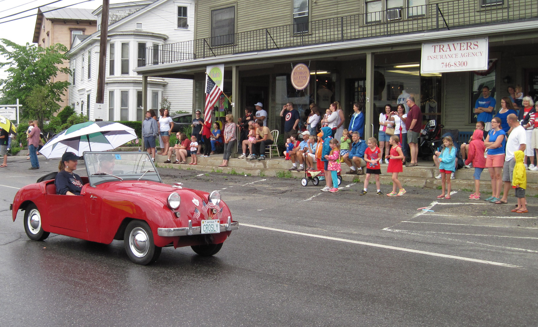 The rain gods must smile on small town festivities. Monsoon rains most of the night and early this morning stopped almost completely for about an hour and a half today for the Fourth of July parade in Contoocook, NH, complete with the kids’ portion. In inset photo are Sue Haines, Jennifer Ford, Margeaux and Simone.