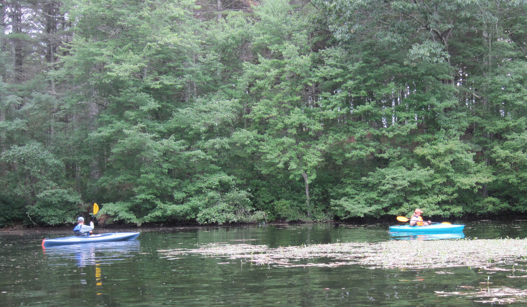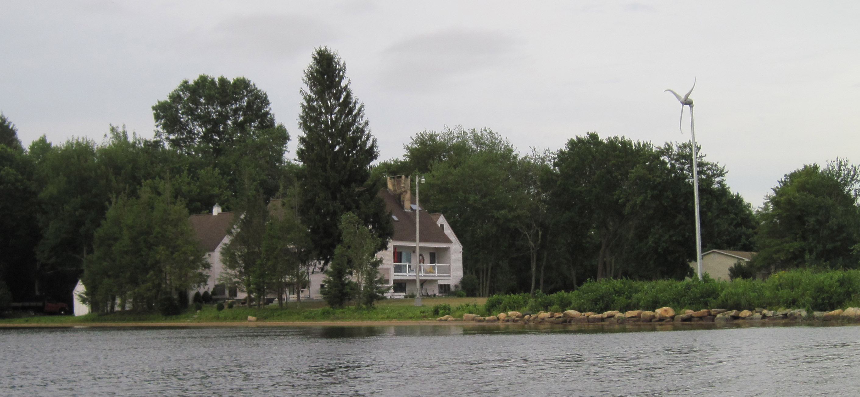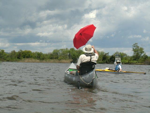 The wind was kicking up whitecaps on Pachaug Pond in Griswold, CT, tonight, so the paddle from the launch to the southeastern end of the lake was a slow crawl, but the ride back with the red umbrella was sweet indeed. I even checked out the sloughs behind some islands under umbrella power. A homeowner on the lake had a windmill to take advantage of the free energy, but a bad bearing in the thing made a screeching sound that could be heard all over. I’d hate to be his neighbor.