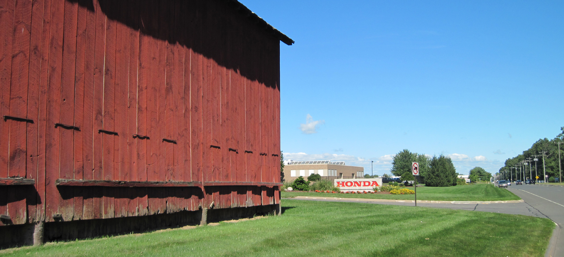 Above and below, the surviving barns and fields of a once-huge industry are now a part of suburban Hartford, taken over by traffic, houses and business parks.  The one adjacent to the Honda plant even gets a finely-mowed lawn.  (See 2017 update)
