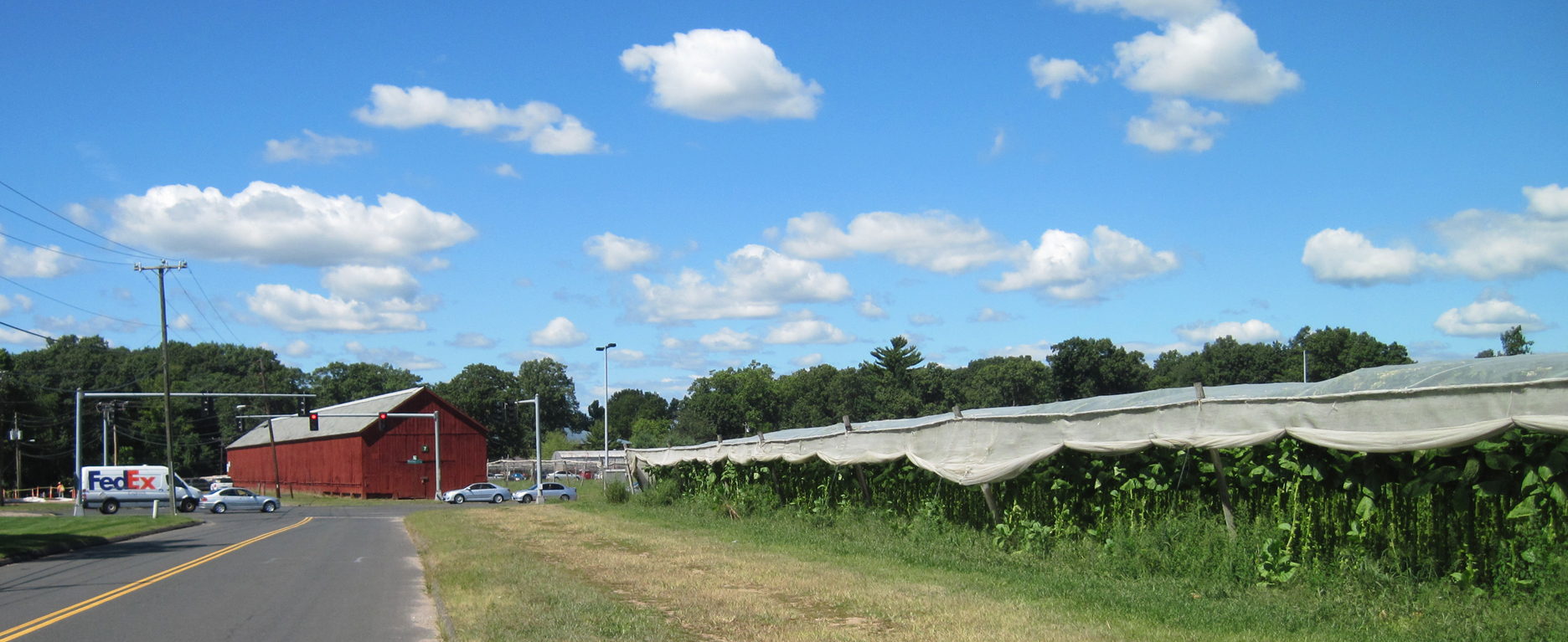From nearly day one I wondered about the cloth-covered growing fields and big red barns I see when taking off and landing. (The airport, called Bradley International Airport, is actually located in semi-rural Windsor Locks, some 13 miles north of Hartford)IMG_0930c‘It’s tobacco,’ someone told me, but that never made complete sense. Why would an unlikely region in the Connecticut River valley be growing tobacco on such a seemingly small scale when there surely must be huge fields in the southern US somewhere to feed the smoking habit?