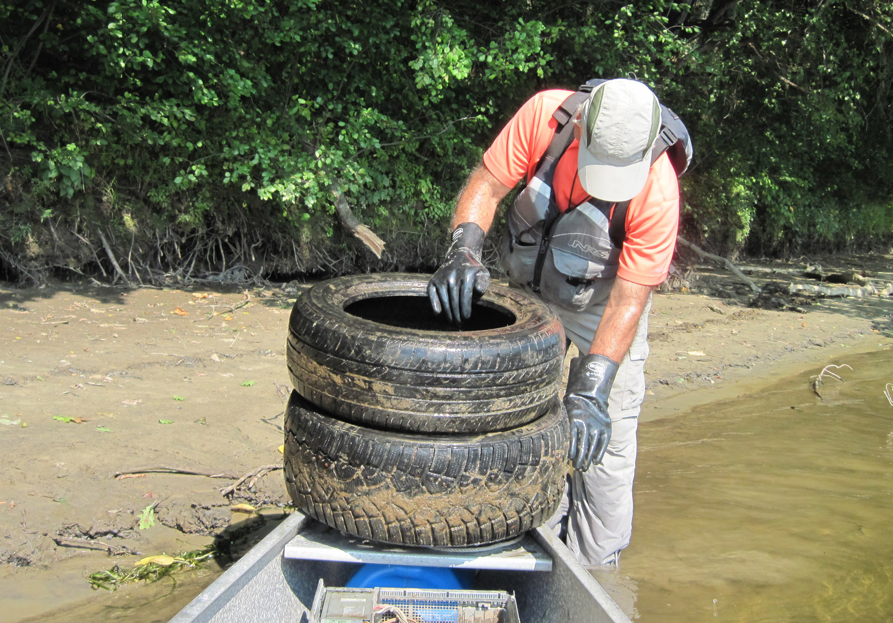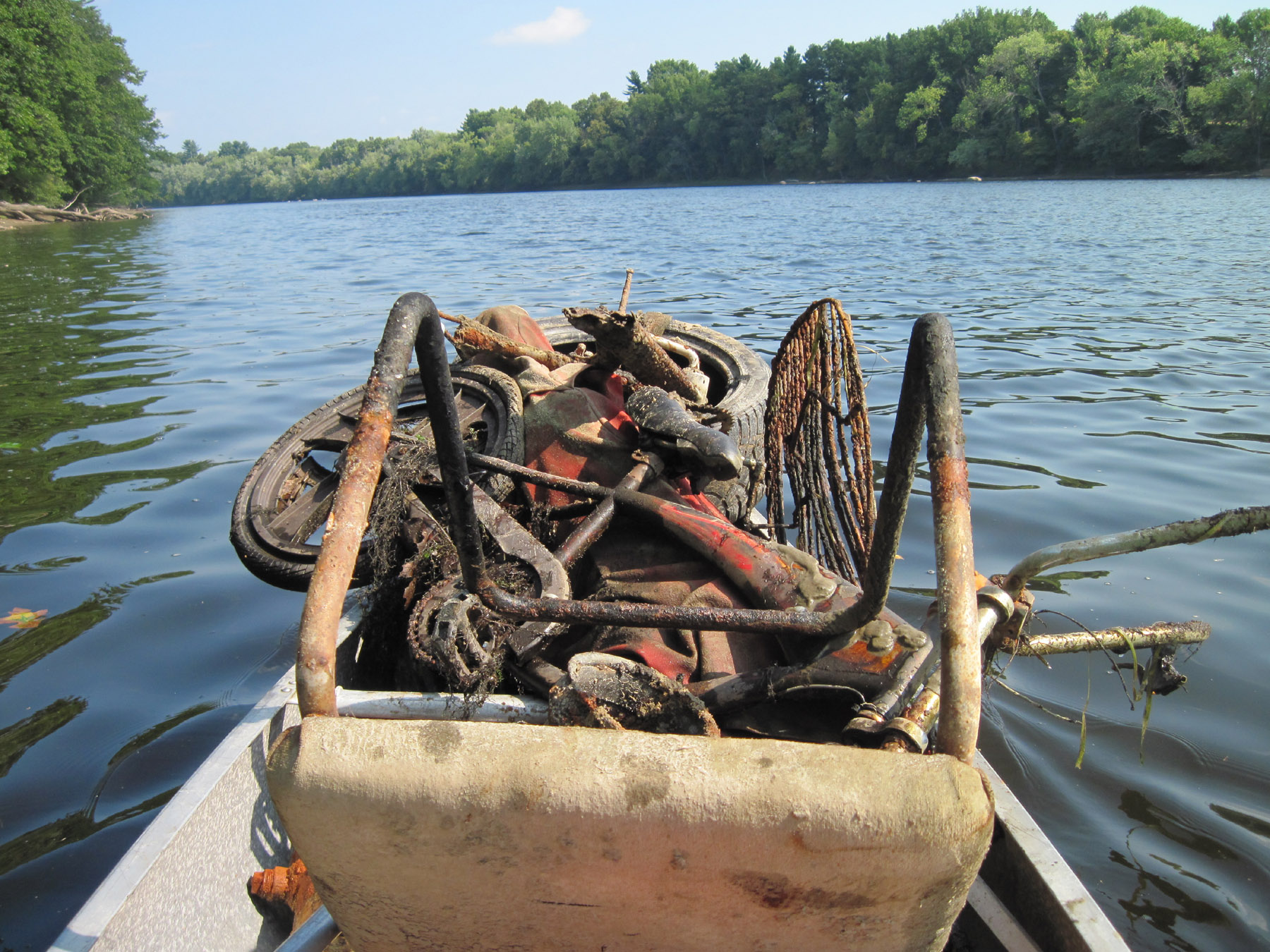 I’ll let Denise report: “We collected a record 13 tires, a couple tire rims, 3 chairs, 2 computers, a bicycle, large insulators, the side off of a piece of play yard equipment, a window frame, several sheets of glass, the grill from a BBQ, a patio umbrella, ceramic pipes, 160 assorted trash items, 110 recyclables, and a beaver skull! All this in approximately 2 miles of river! The Great Blue Heron sighting was a value added event!”