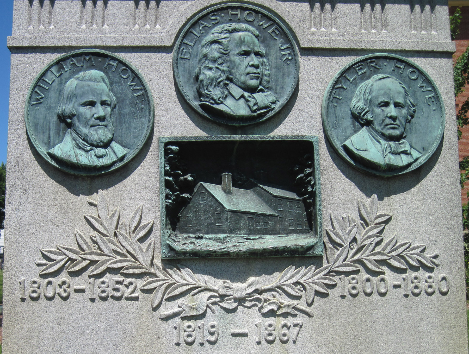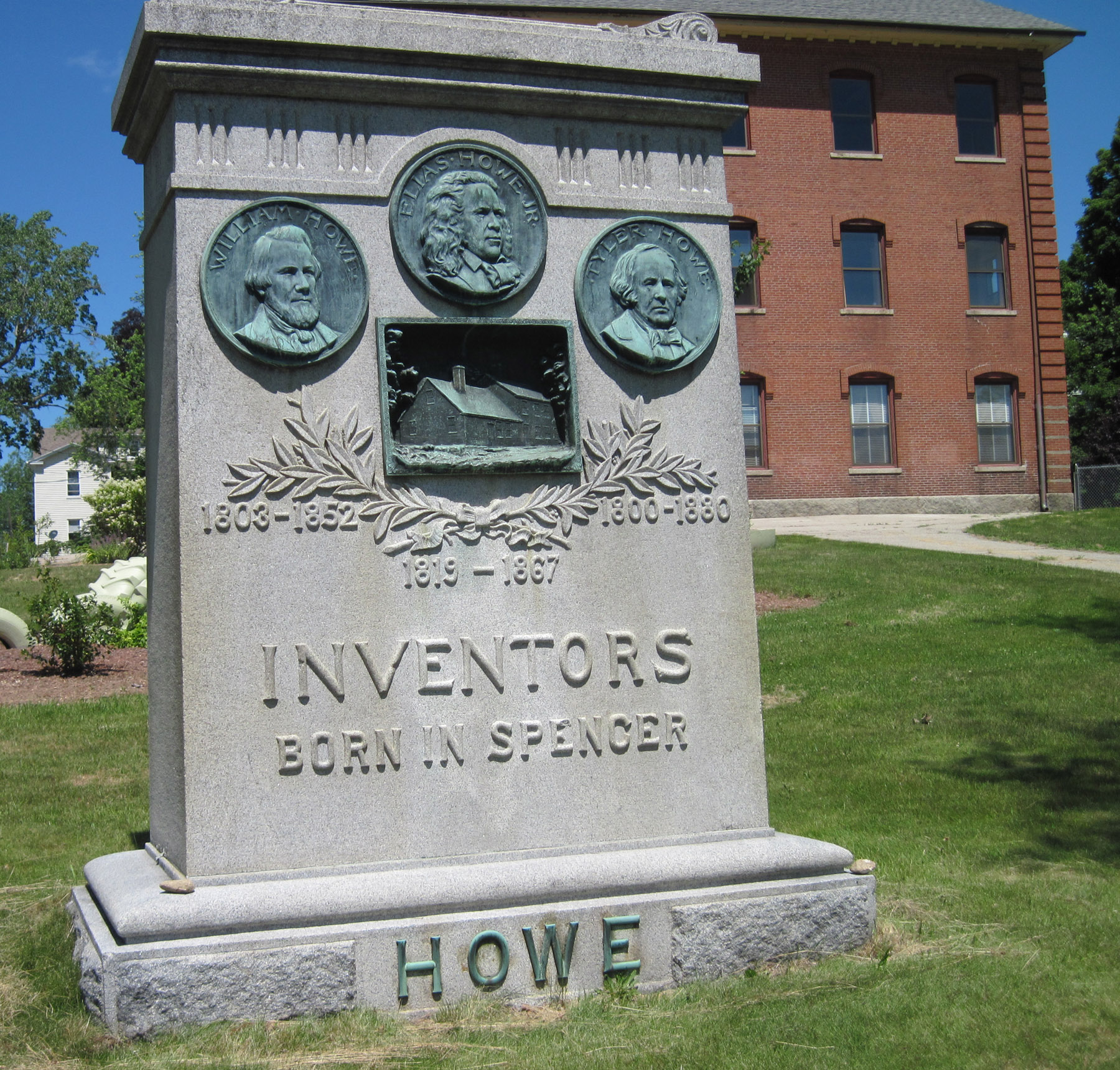 IMG_1895cUnveiled in 1909, the monument recognized the inventive minds of three Spencer natives: brothers William and Tyler Howe, and their nephew Elias Howe Jr. It was originally sited at town hall, about a half mile up Main Street from its present location. The building behind it, then the West Main Street School, is now a private residence.