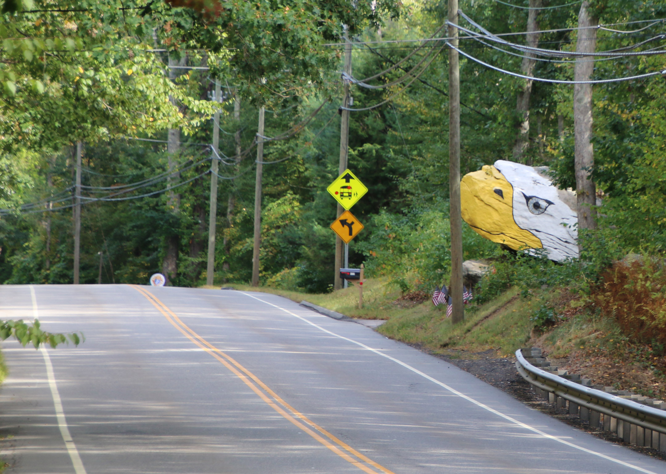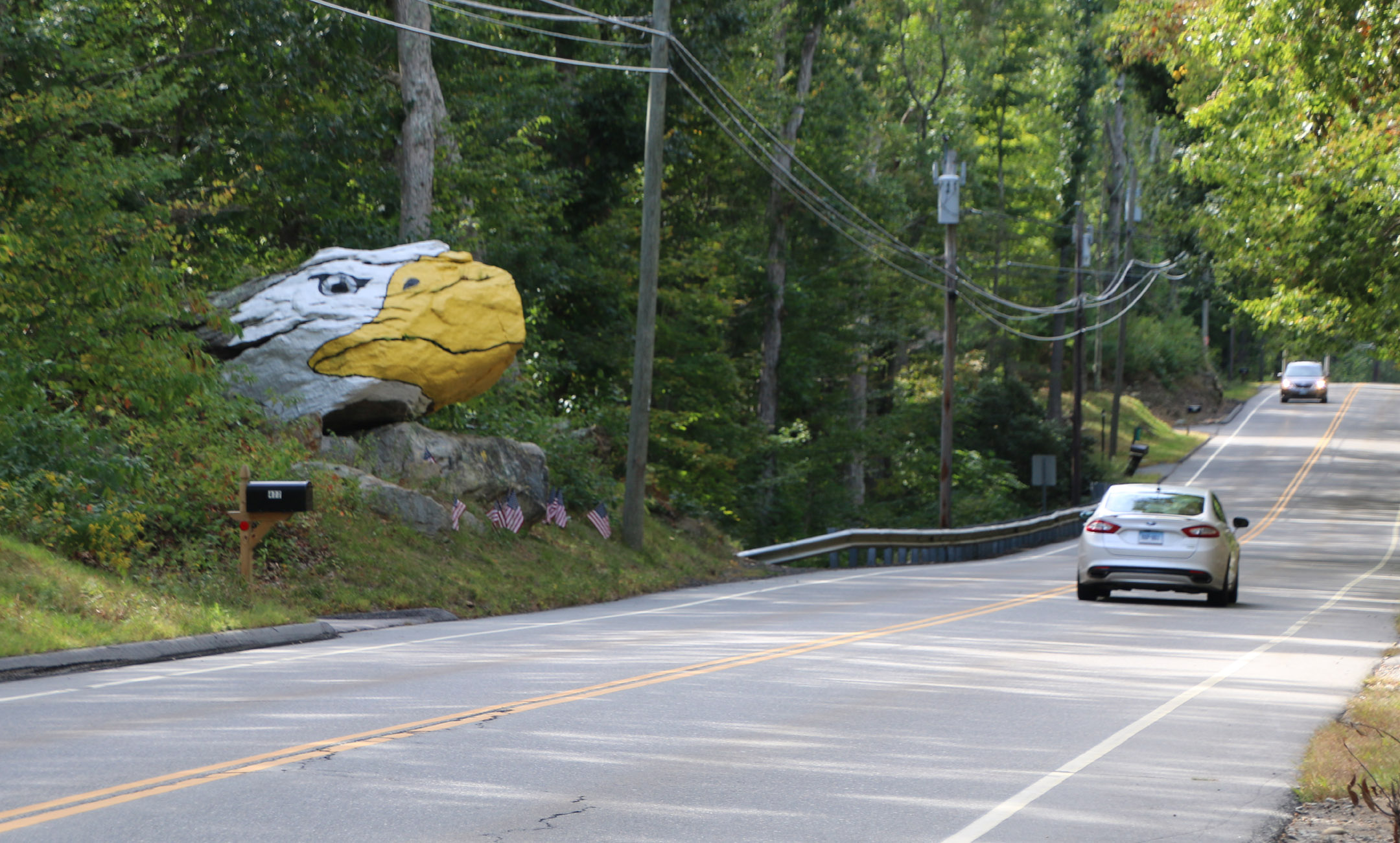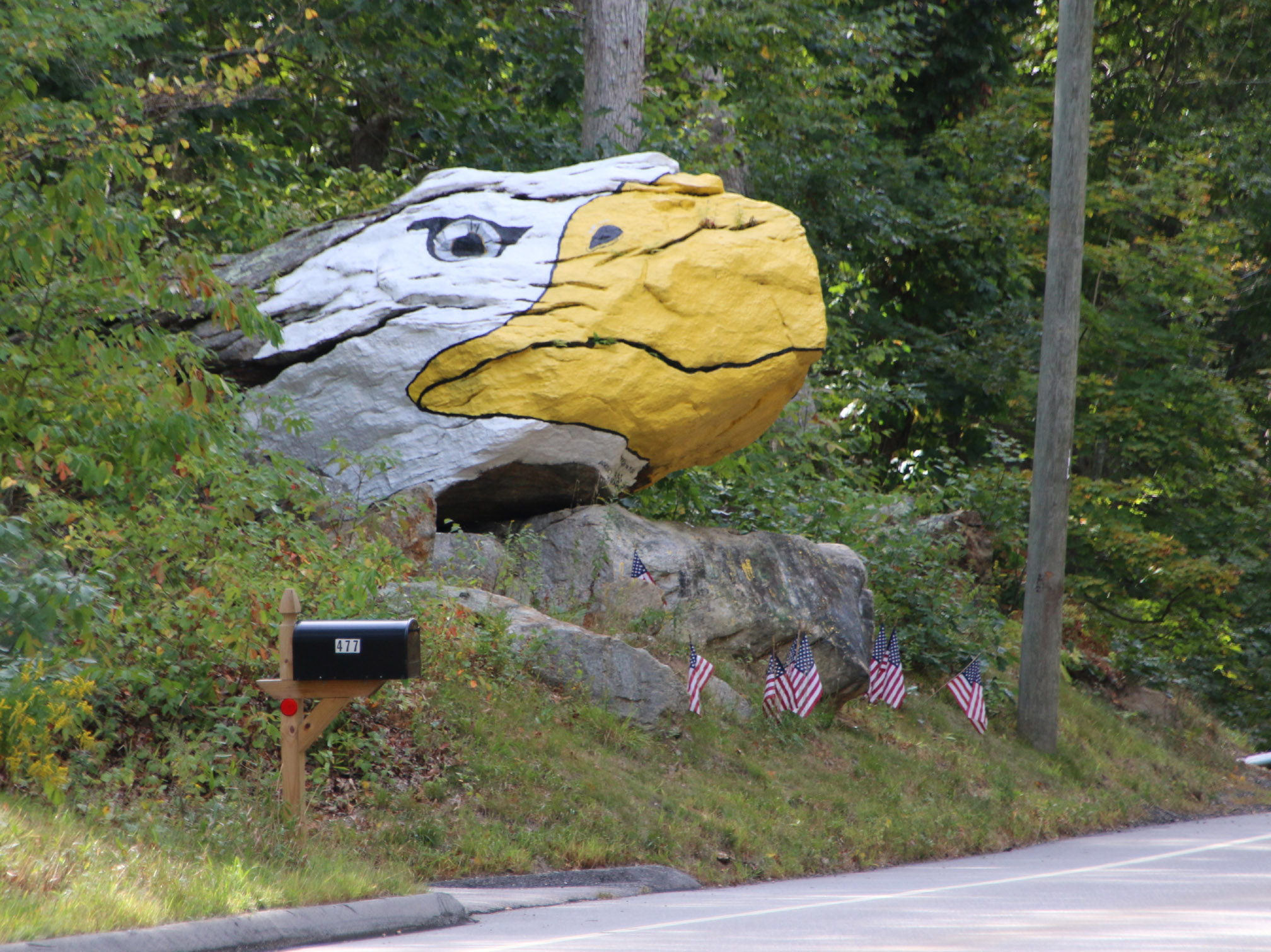 Just west of Hebron along Route 66 in Connecticut is a rock that really sticks out. Painted to resemble a bald eagle, it looms over the road and looks great from either direction.