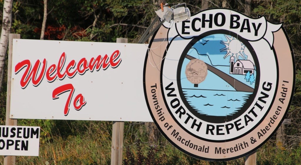 This is one of the cleverest town signs I’ve seen in my travels. It welcomes one into Echo Bay, Ontario, a small Canadian hamlet on Lake George.