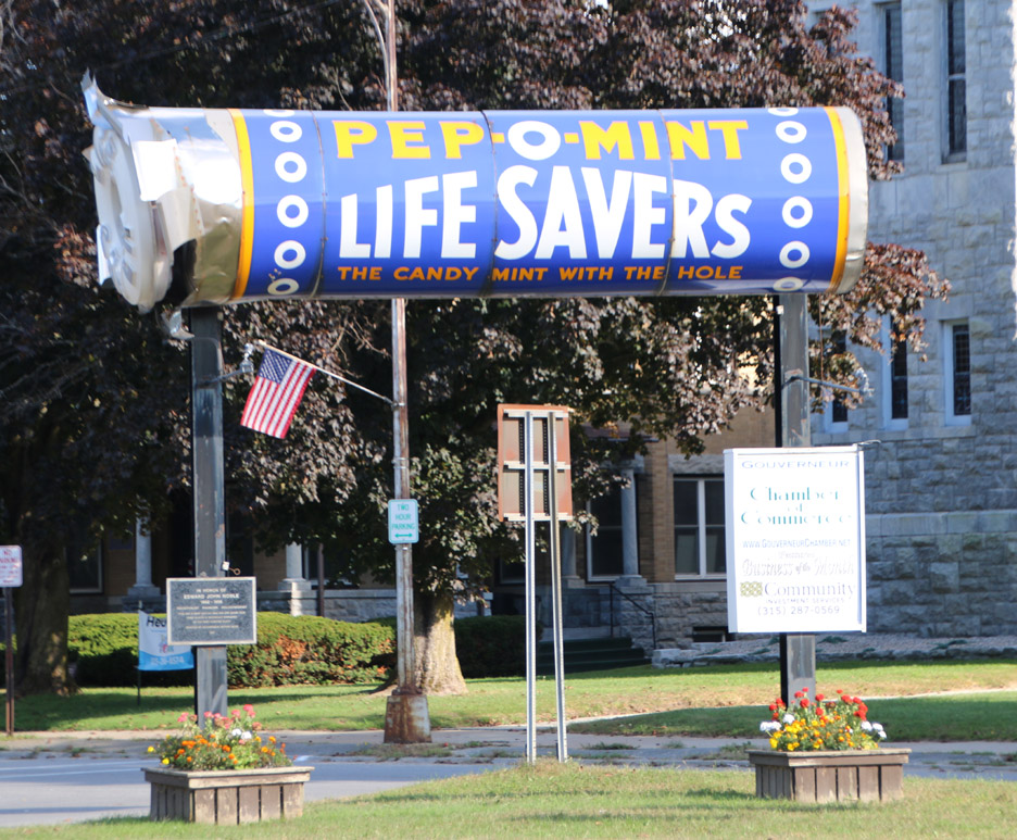 So, what’s that monument on Main Street all about? Turns out it’s there because Gouverneur is the birthplace of Edward John Noble, the man credited with putting Life Savers on the map. It used to adorn the headquarters of the Life Savers Candy Corporation in Port Chester, on Long Island Sound, some 350 miles south.