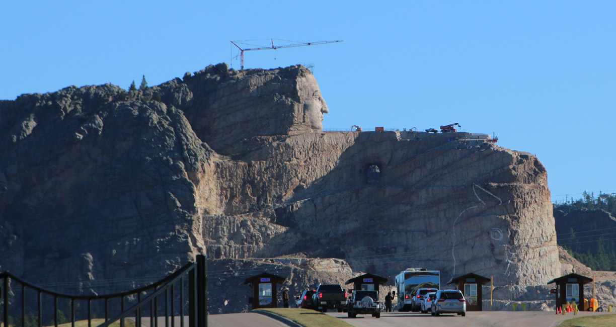 When finished, the Crazy Horse Memorial will dwarf Mount Rushmore; Crazy Horse’s head alone is bigger than the four presidential heads combined.
