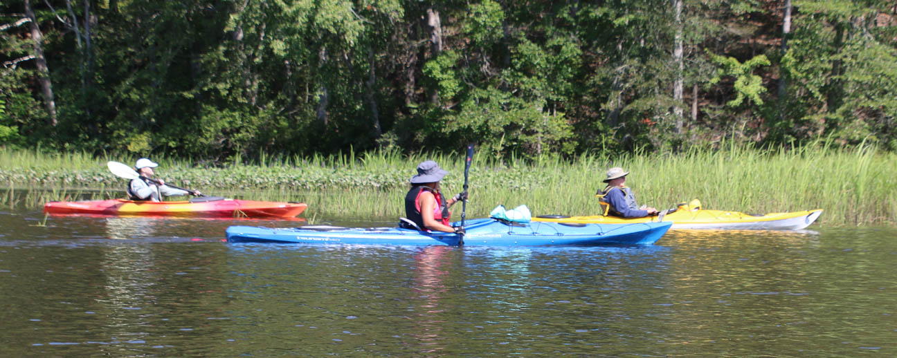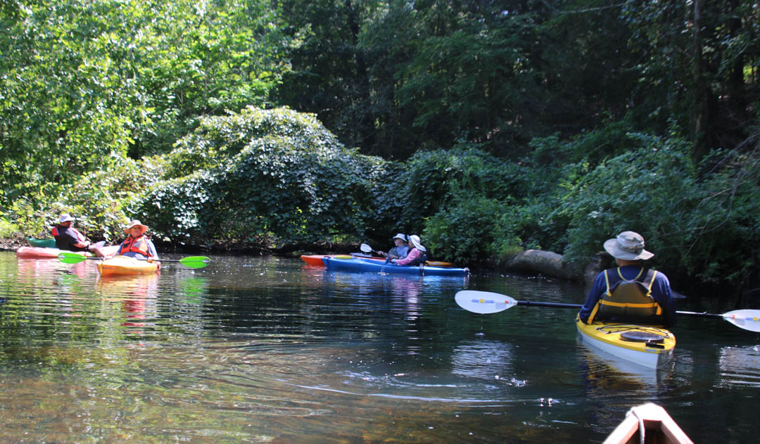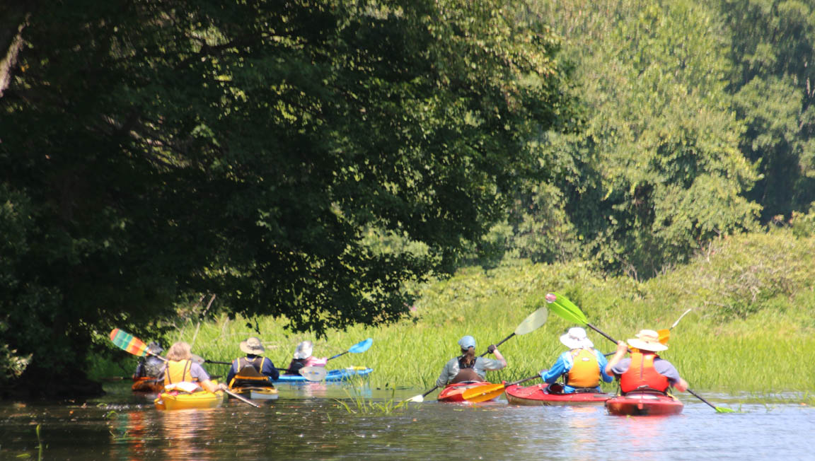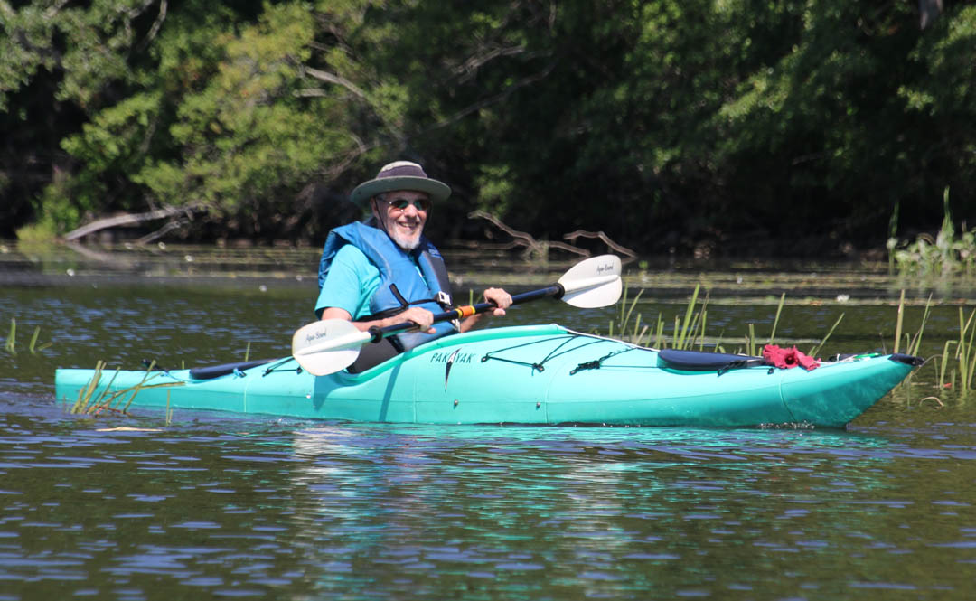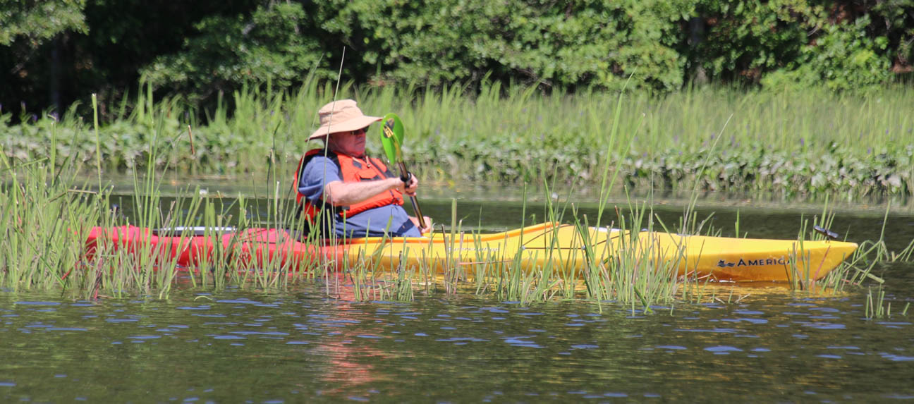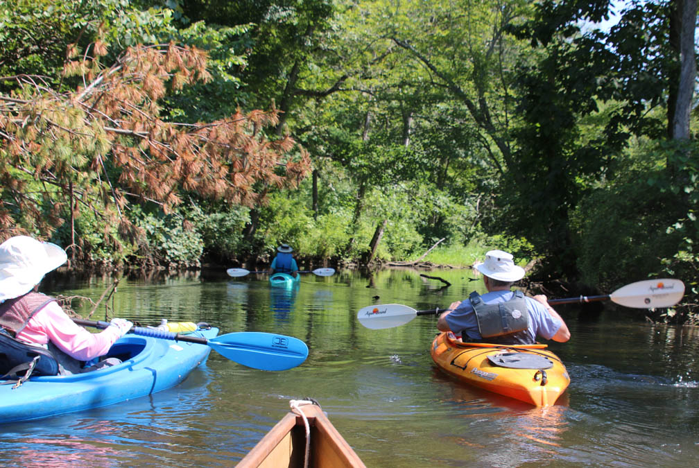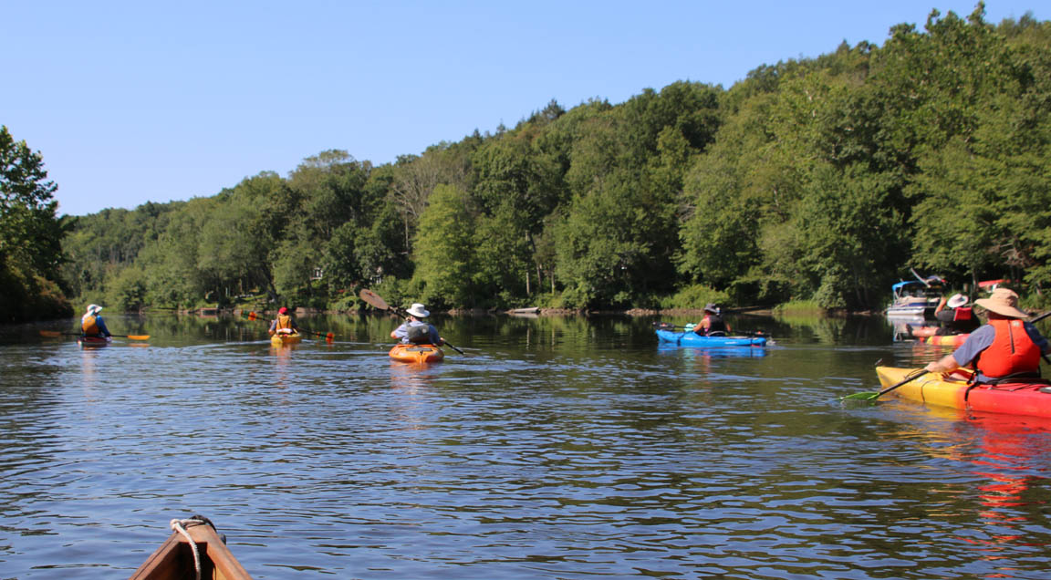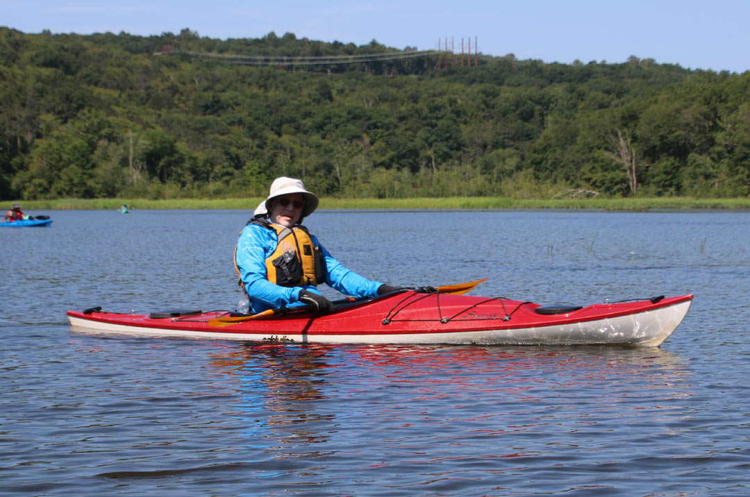 Secondly, the venue is delightful. There is very little open water, which I find boring. Instead there were lots of narrow bits and overhanging trees that provided a lot of shade on the warm clear day we had. And there are two tributaries, the Moodus River and Pine Brook, to explore a bit. My favorite part is always the narrow passage upstream to the dam just beyond the Route 151 bridge at Leesville. Even the launch area is pleasant, nestled along the river in the quiet, undeveloped Sunrise State Park, the site of a former resort. It’s a totally relaxing, leisurely trip of about seven miles.