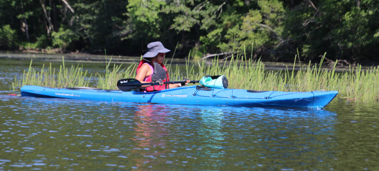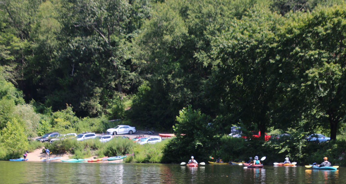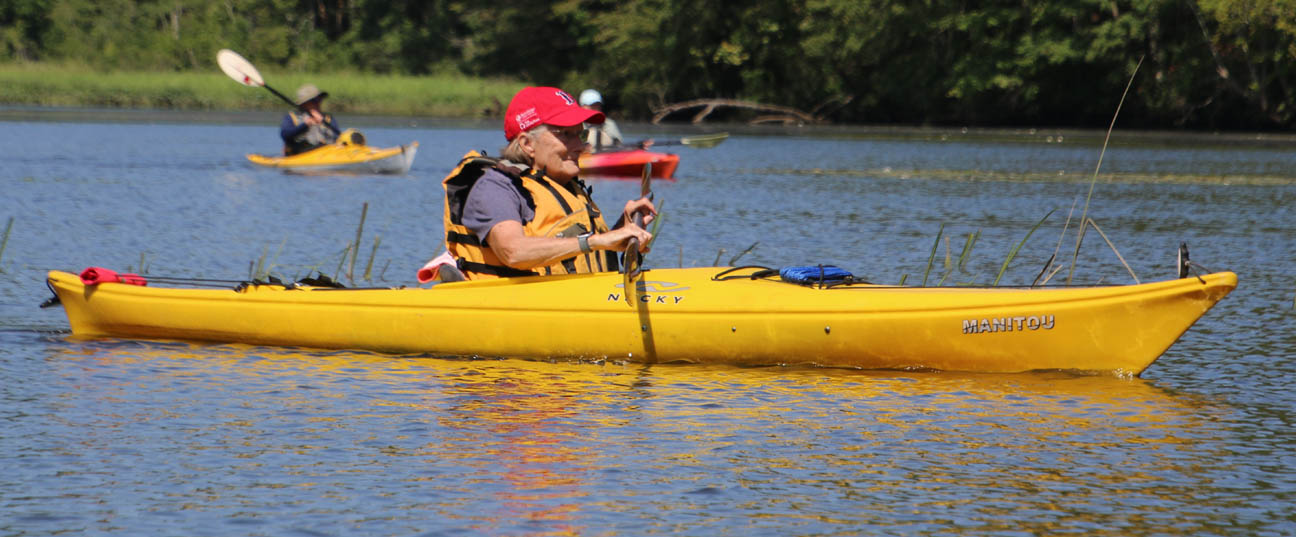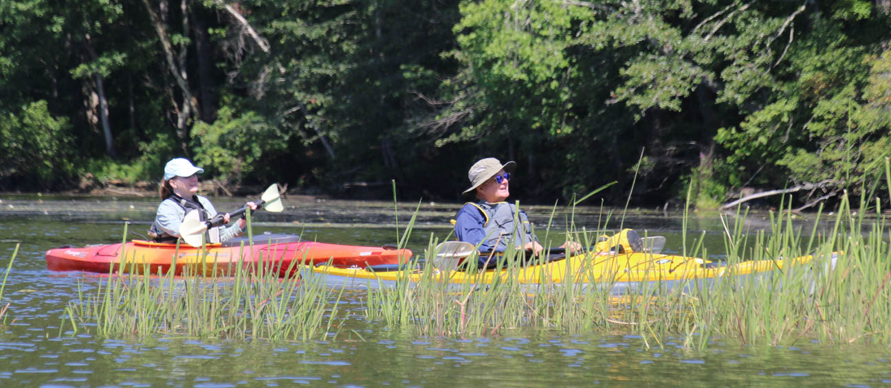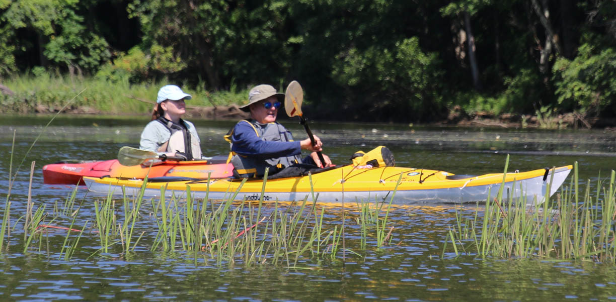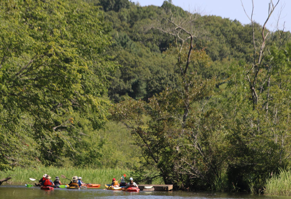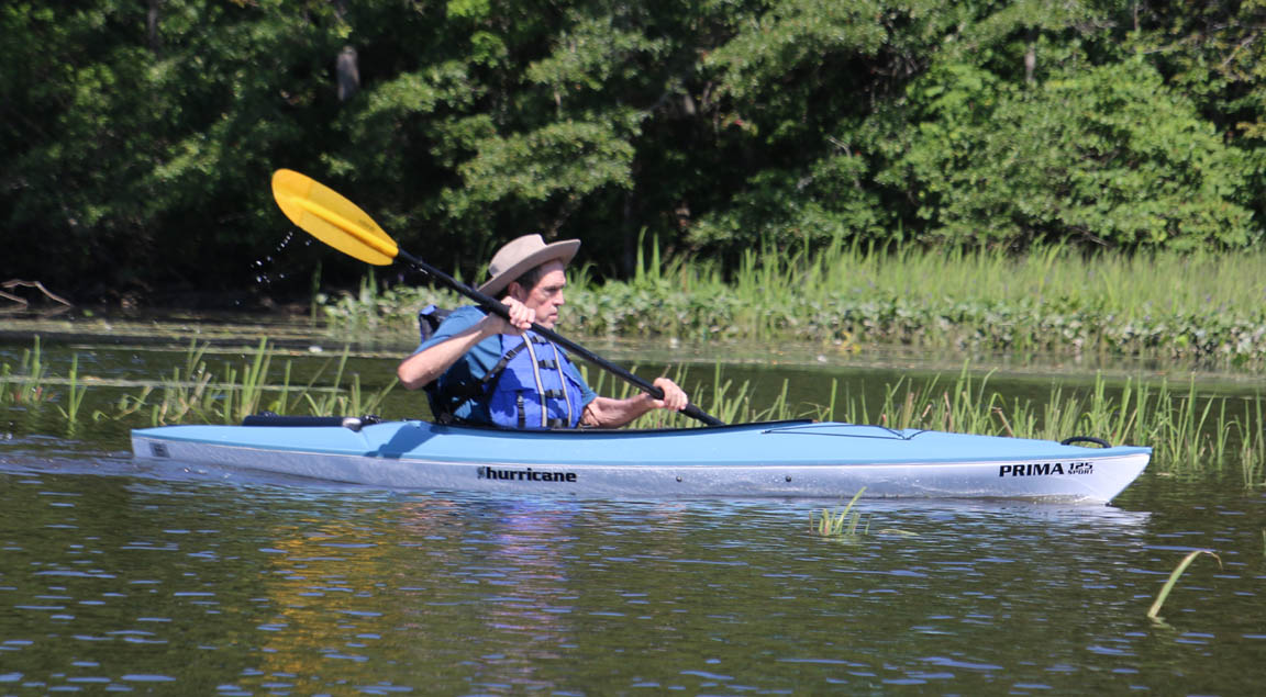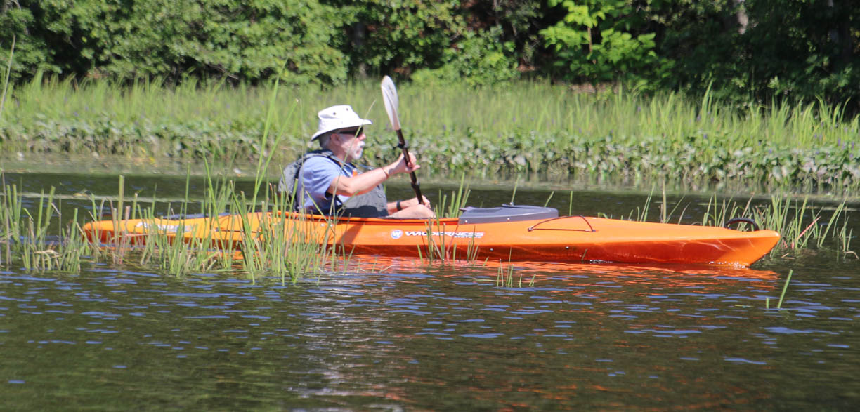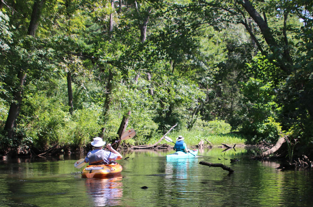 Secondly, the venue is delightful. There is very little open water, which I find boring. Instead there were lots of narrow bits and overhanging trees that provided a lot of shade on the warm clear day we had. And there are two tributaries, the Moodus River and Pine Brook, to explore a bit. My favorite part is always the narrow passage upstream to the dam just beyond the Route 151 bridge at Leesville. Even the launch area is pleasant, nestled along the river in the quiet, undeveloped Sunrise State Park, the site of a former resort. It’s a totally relaxing, leisurely trip of about seven miles.