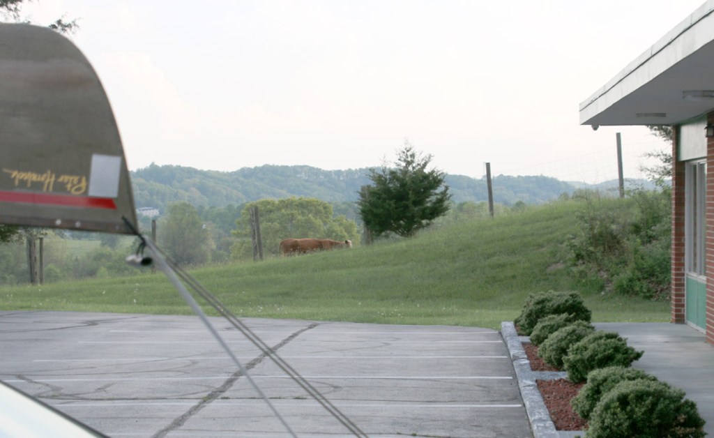 The Alpine is barely a half mile off the interstate, but up on a hill, with the road out of sight and sound down in a valley. On the west end of town, the place has a rural feel, and even a cow next door. The rooms have been rehabbed and the management changed since my last stay, but the price was up only $20 a night from five years ago.