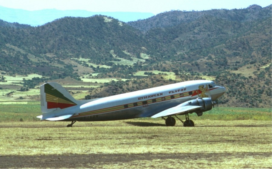 Then and now: A DC-3 on the grass runway at Lalibela in the 1970’s and today a prop jet on concrete and a terminal building.