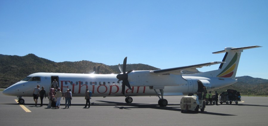 Then and now: A DC-3 on the grass runway at Lalibela in the 1970’s and today a prop jet on concrete and a terminal building.
