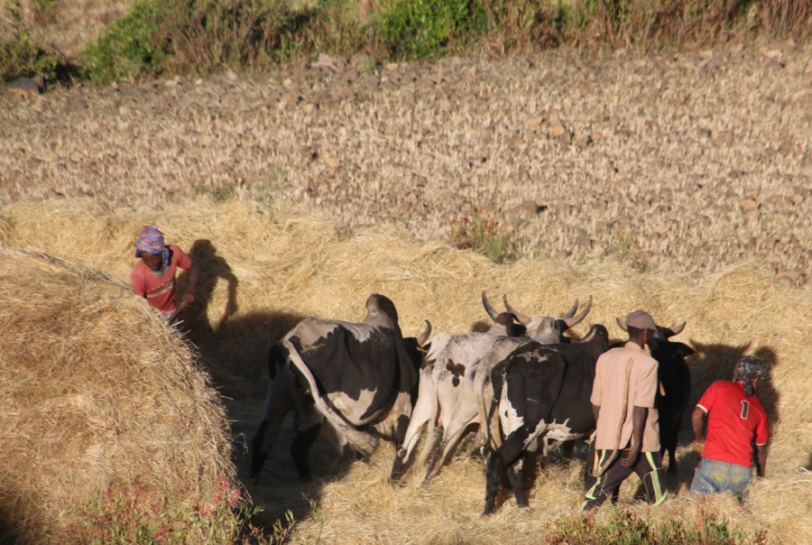 Threshing. Oxen are guided in a circle over a pile of teff, to shake the seeds loose from the grass.