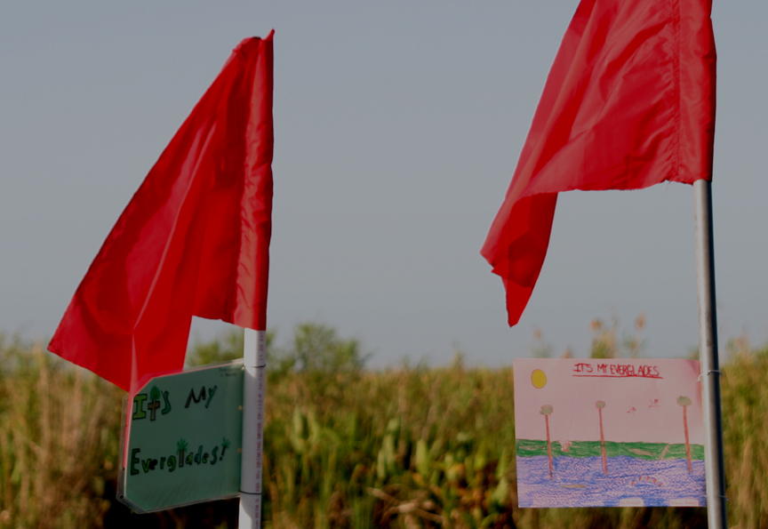 One of our paddlers, Victor Suarez of the Broward County Environmental Protection and Growth Management Department, came to the launch armed with a sheaf of drawings done by his young daughter and her classmates. Each repeated the theme of this expedition “It’s My Everglades” and many of them soon took a proud place on the poles below the red safety flags.