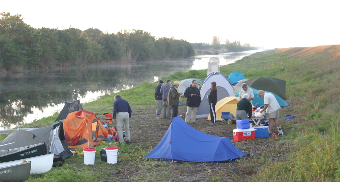 We camped out atop the levee, about two miles west of Stonebridge Golf and Country Club in Boca Raton. We set up the ‘meeting room,’ a large, teepee-shaped tent in which we could gather together if driven inside by rain or mosquitoes. As it turned out, we had no rain, and the mosquitoes, while numerous and aggressive, only set upon us for about a half hour each evening and some mornings and then dropped off or disappeared entirely the rest of the time.